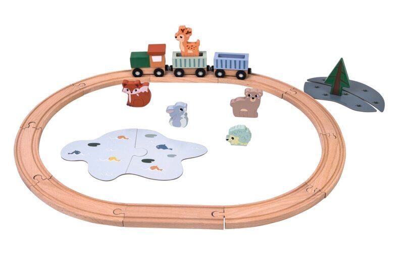 Der 24-teilige Holzzug mit Tieren und Tannenbaum bringt Bewegung, Fantasie und Natur ins Kinderzimmer.